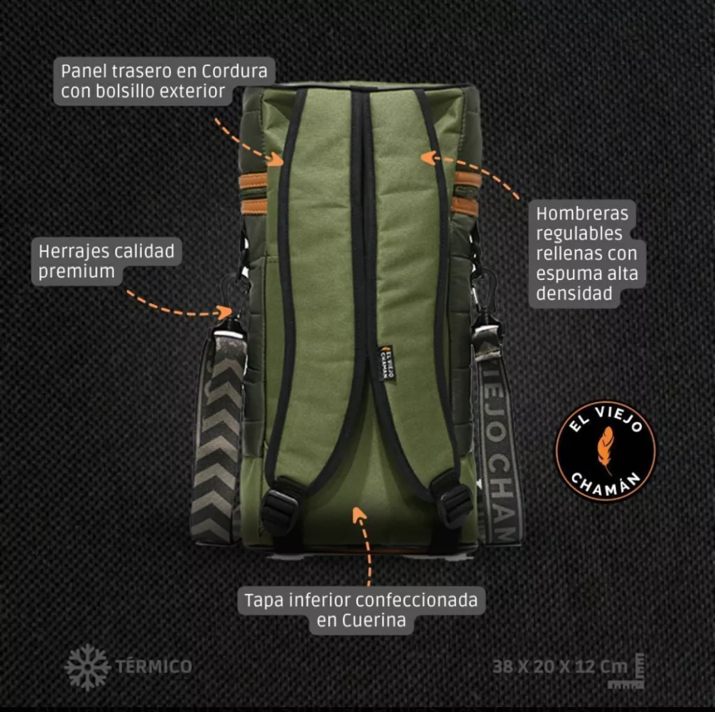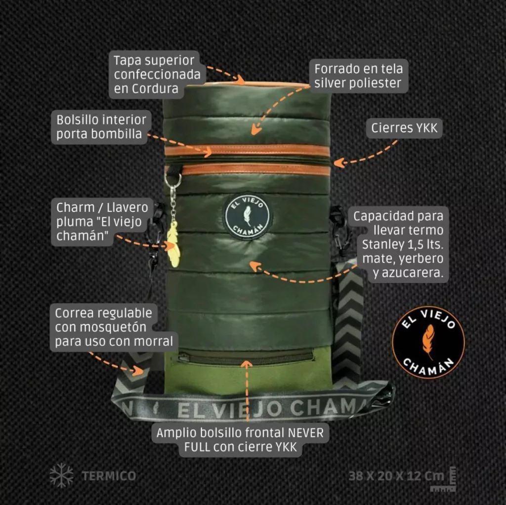 Las hombreras regulables rellenas con espuma te aseguran comodidad en todo momento, y en su interior encontrarás un bolsillo porta bombilla y suficiente espacio para un termo Stanley de 1,5 litros, yerbera, azucarera y por supuesto, tu mate. También cuenta con un bolsillo amplio frontal con cierre YKK para llevar tus llaves, celular y billetera.